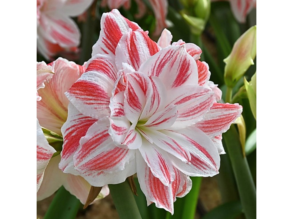 Amarylka ze skupiny Double Galaxy má velké, bílé, růžovo červeně pruhované květy.