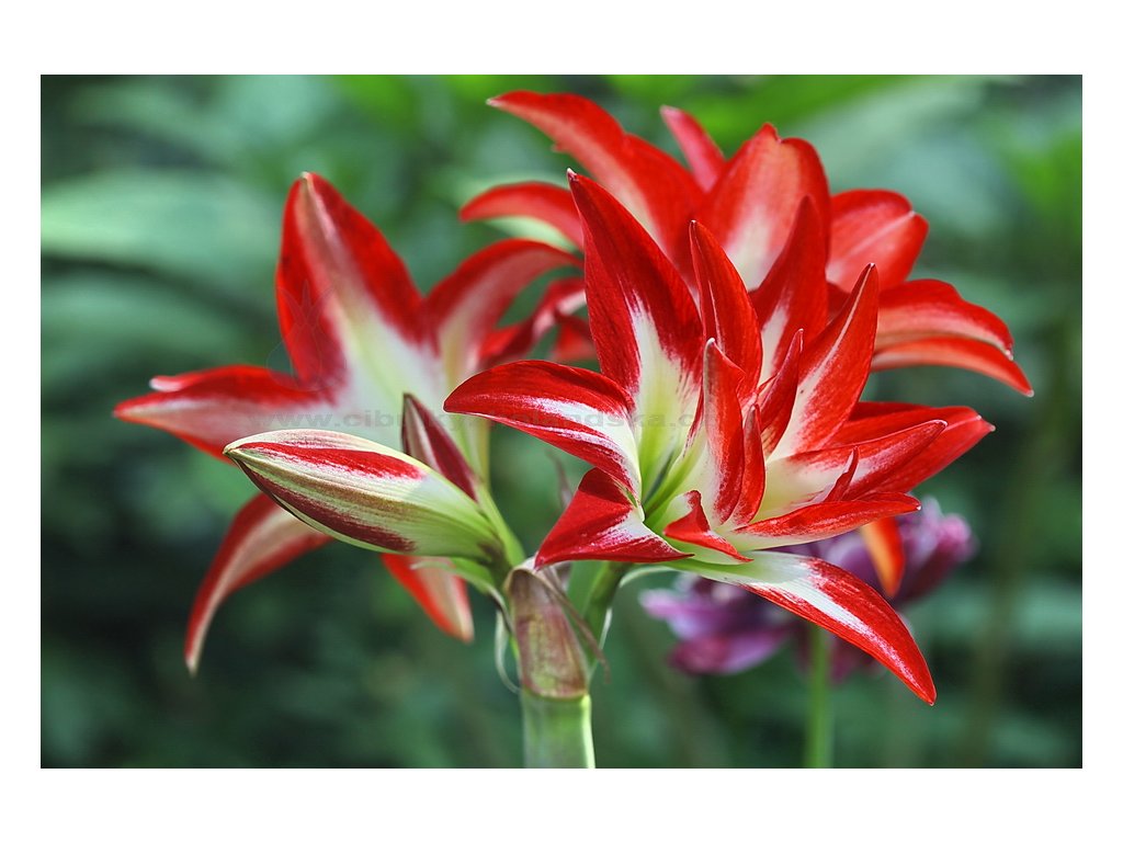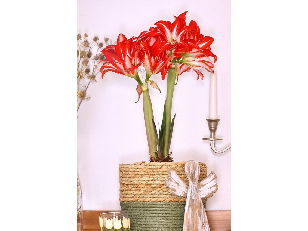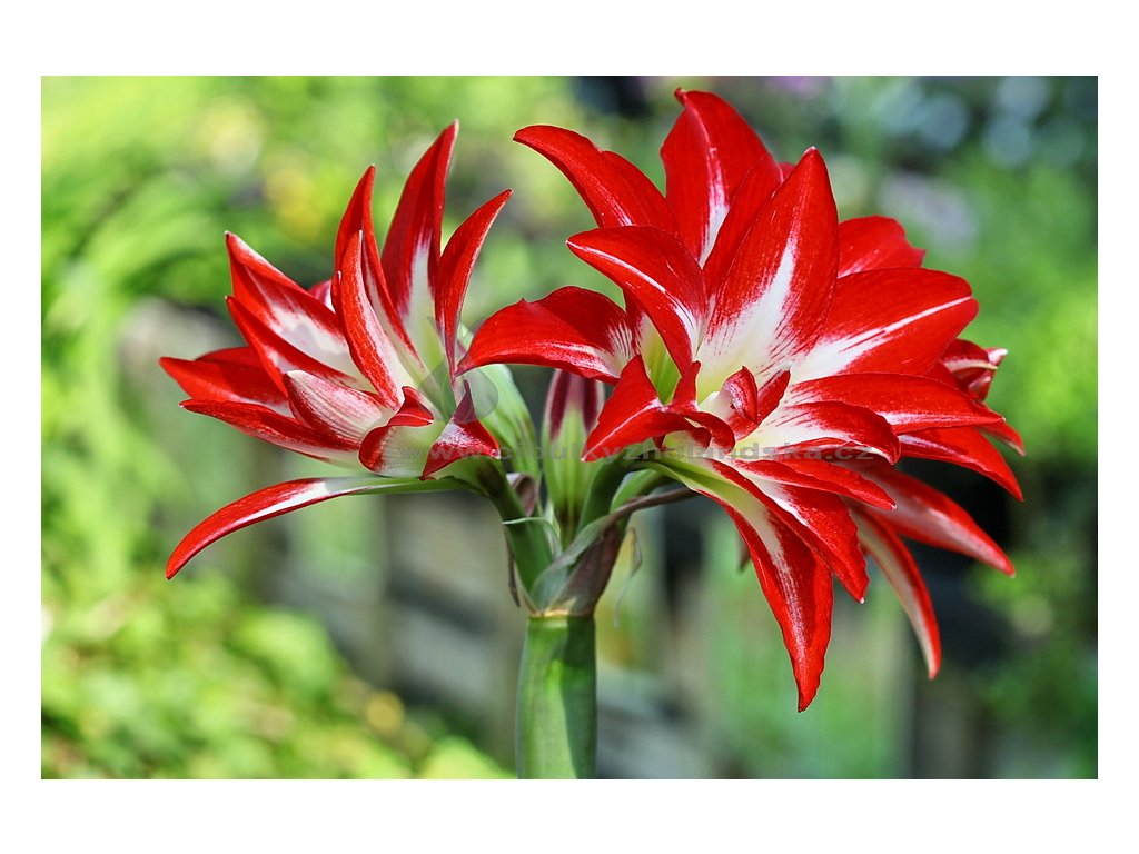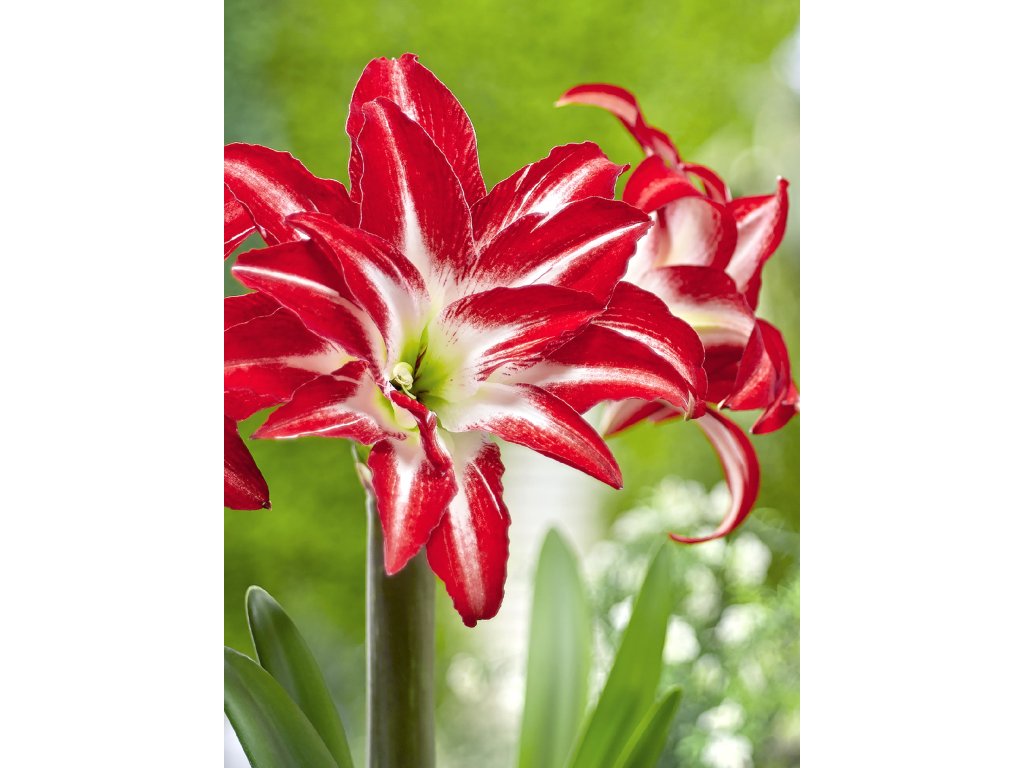 Opravdu nádherná plnokvětá amarylka, s jasně červenými květy s bílým středem, neobvyklého tvaru.