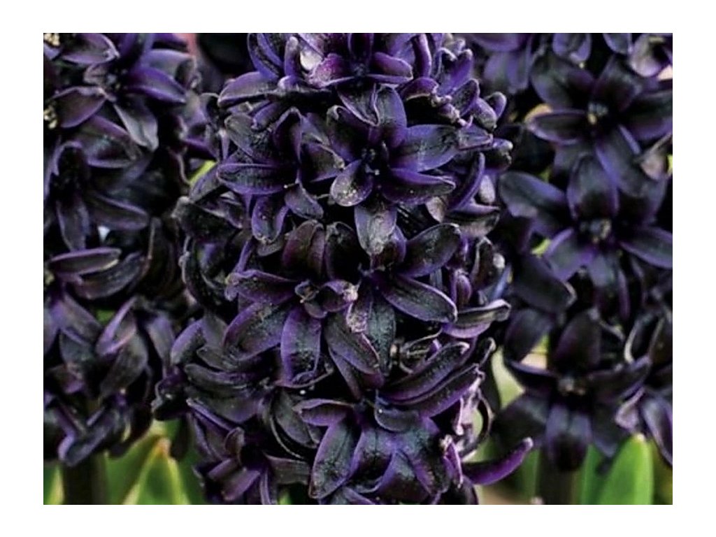 Tento ohromující hyacint je téměř černý. Květy jsou v základu fialové, jejich středem však prochází silnější tmavě fialový až téměř černý pruh.