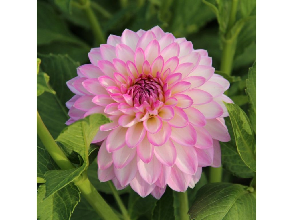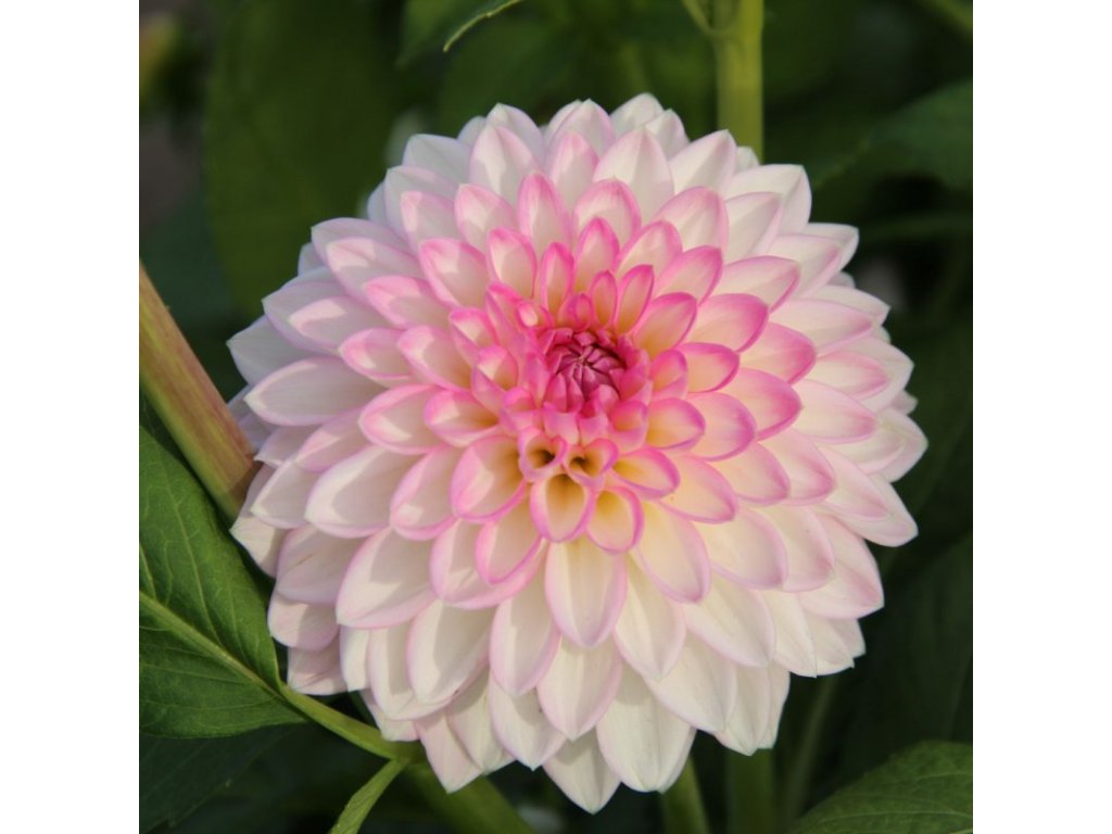 Dekorativní jiřina, bílá s lila-růžovými okraji, velikost květu 10 cm.