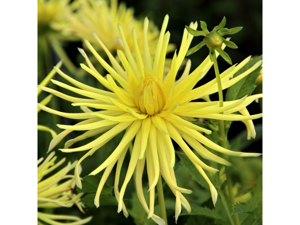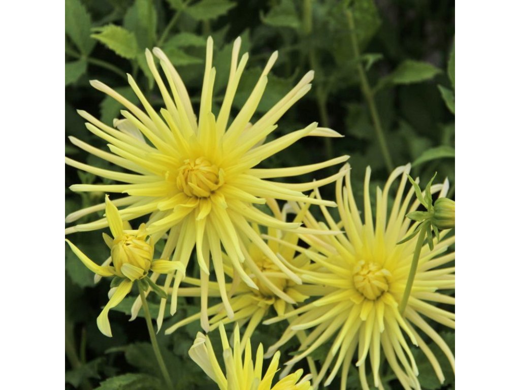 Krásná žlutá kaktusová jiřina s velikostí květu přibližně 15 cm a výškou přes 1 metr.