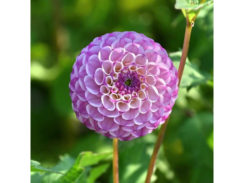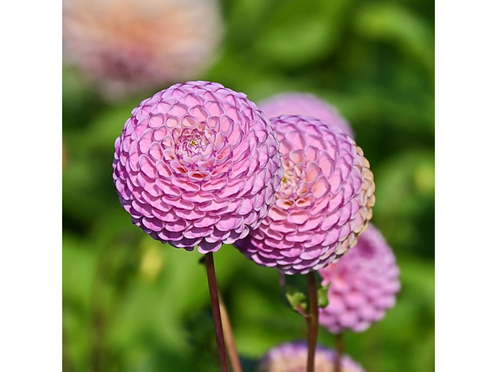 Pomponová jiřinka s lila-růžovými, malými, kulatými květy. Vnitřek okvětních lístků je mírně bílý. Velikost květu 5 cm.