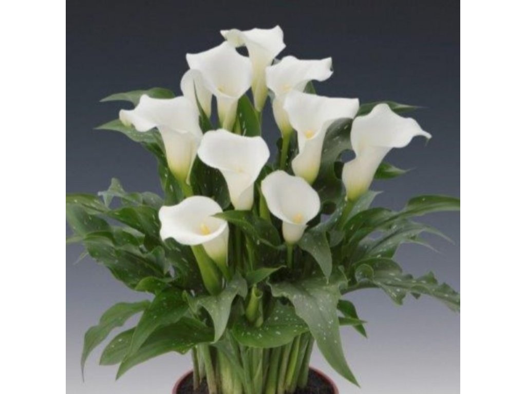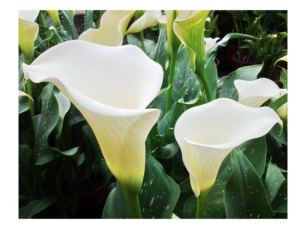 Čistě bílá kala. Všechny kaly vyniknou nejlépe, pěstujeme-li více hlíz stejné barvy ve skupině. Nezapomeňte je přihnojovat pro silné kvetení.