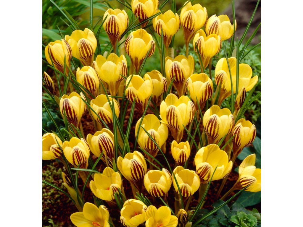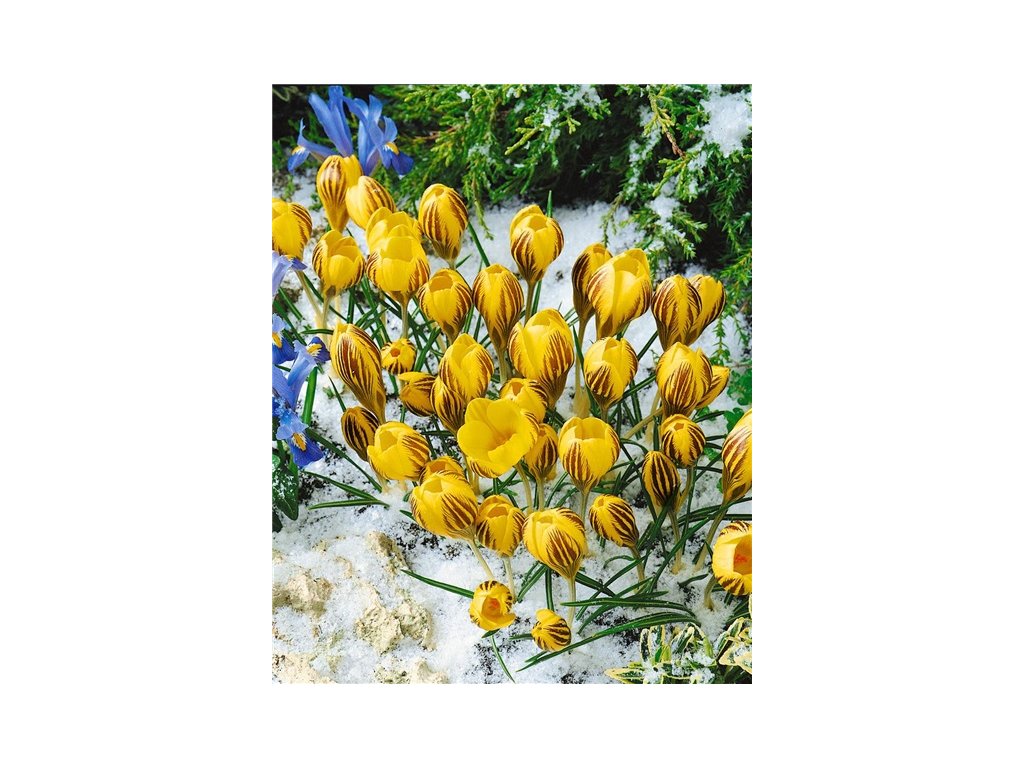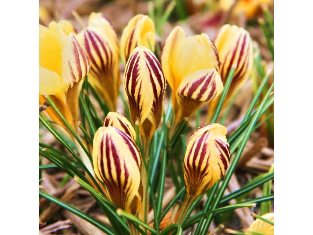Velké žluté květy, silně purpurově žíhané, vykvétají postupně po několika květech.