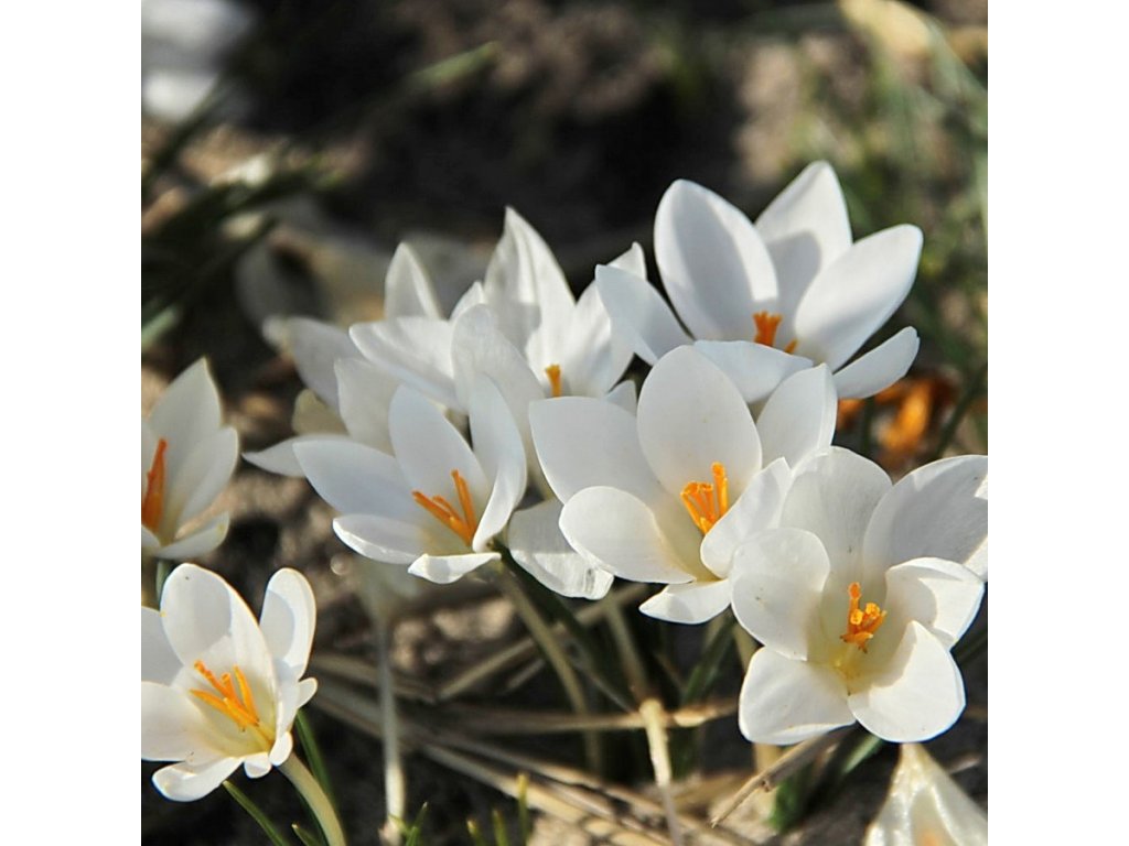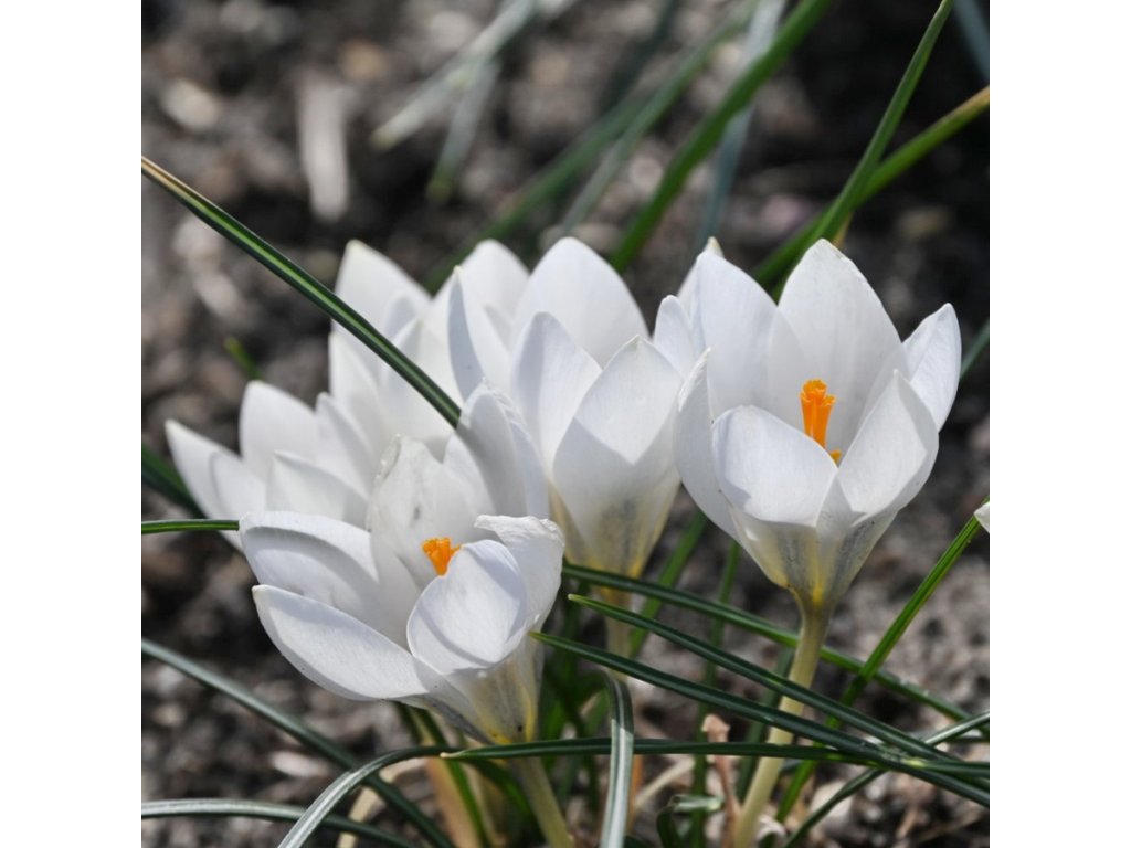 Drobnokvětý krokus, slonovinově bílý se světle modrými skvrnami na spodní straně okvětních lístků, vnitřek je bílý, směrem k srdci šedobílý. Zářivě oranžové tyčinky. Vynikající pro zplanění.