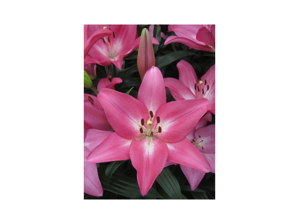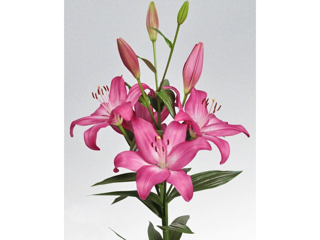 Tmavě růžová lilie které ve středu květu přechází až do bílé, a tam je ozdobena několika čevenými tečkami.