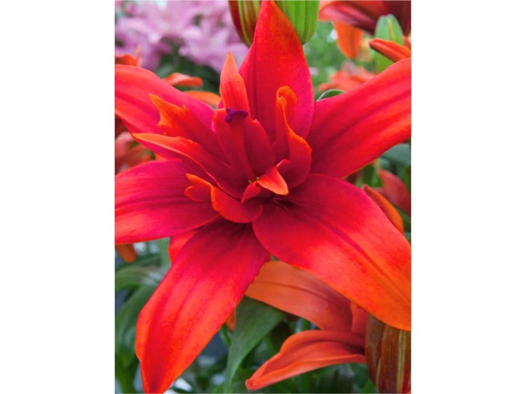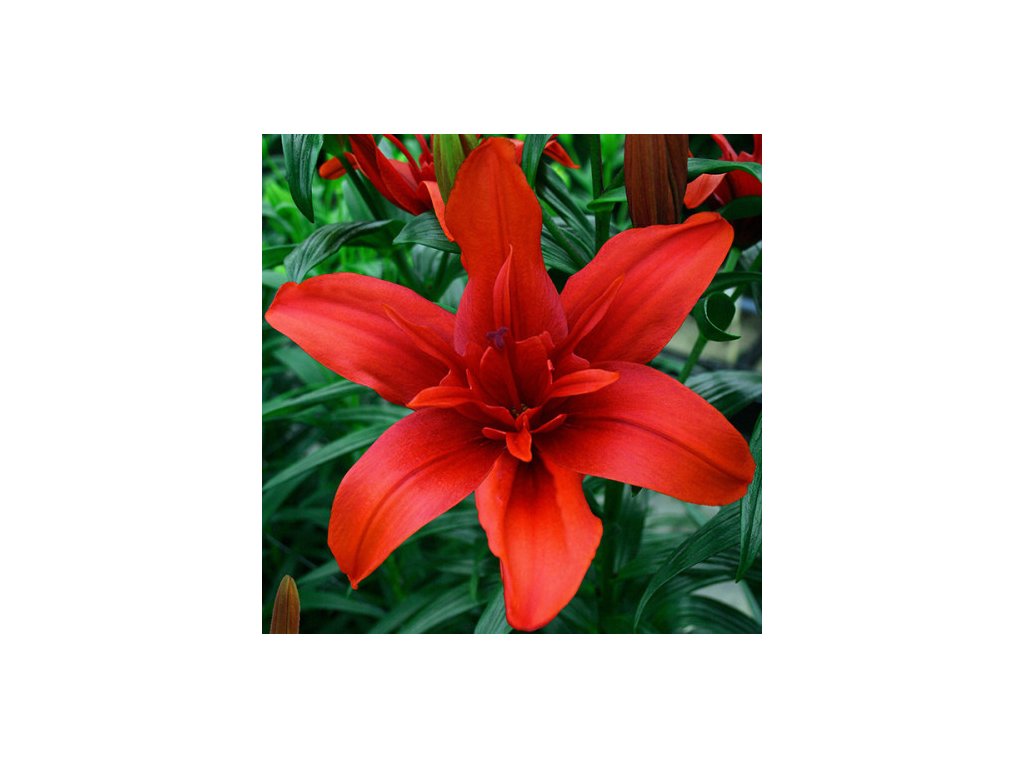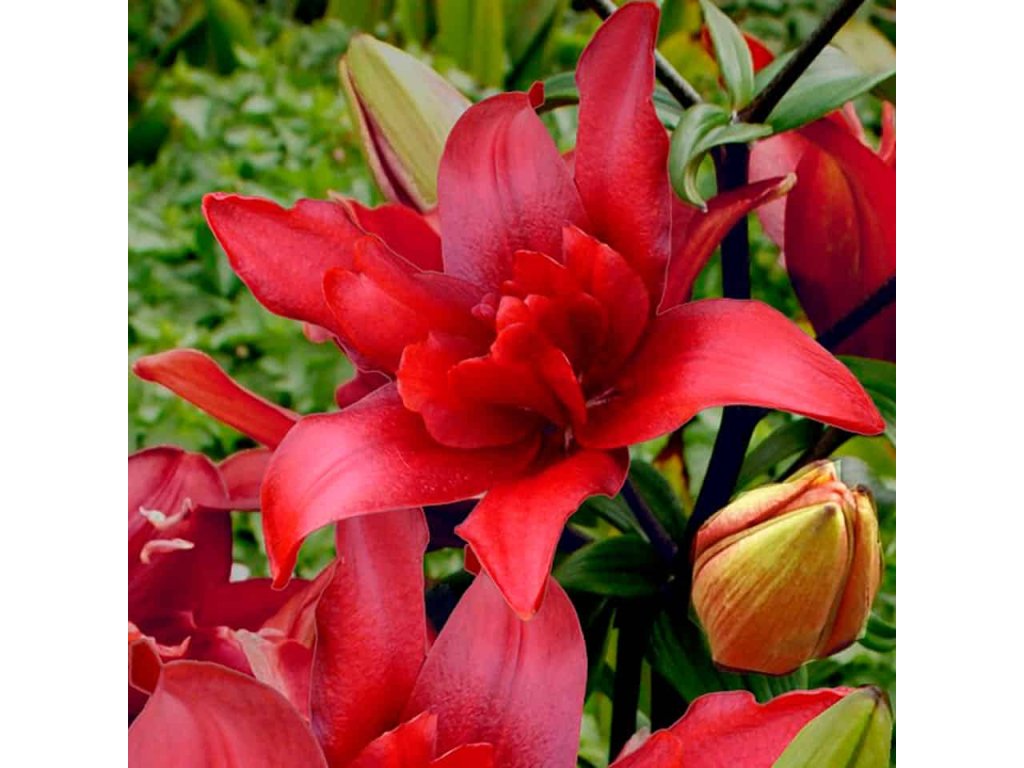 Třešňově červené plné květy. Lilie vhodná do popředí záhonů nebo do nádob.