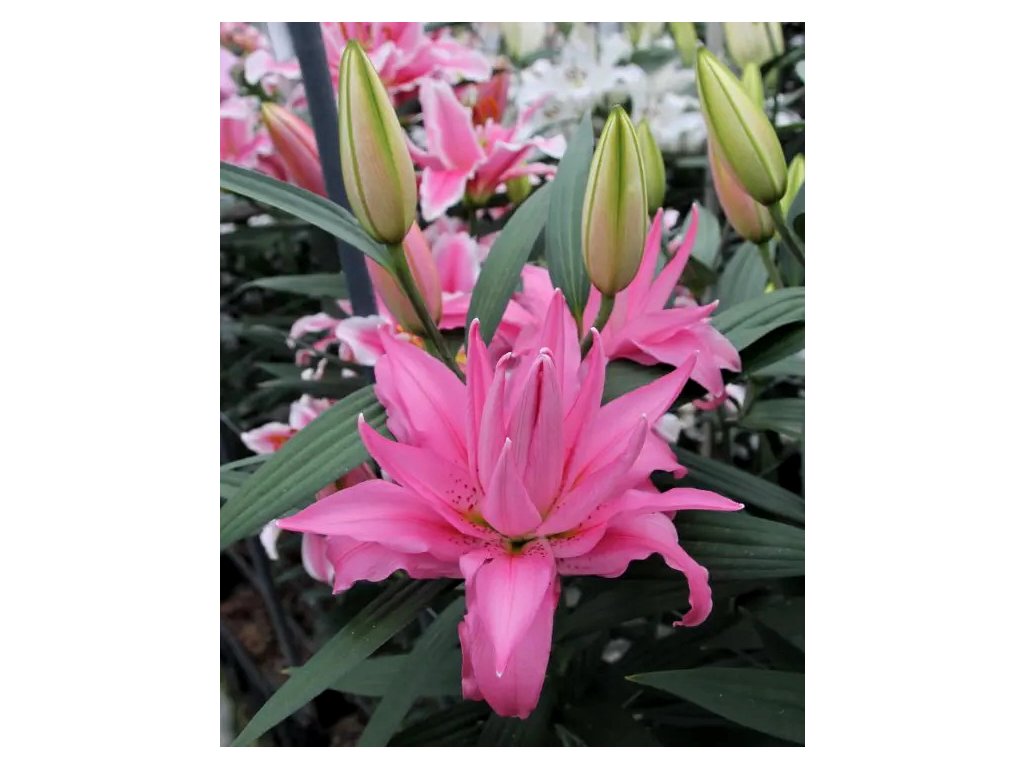 Růžová plnokvětá orientální lilie s tenkými okvětními lístky, které jsou ozdobené červenými tečkami.
