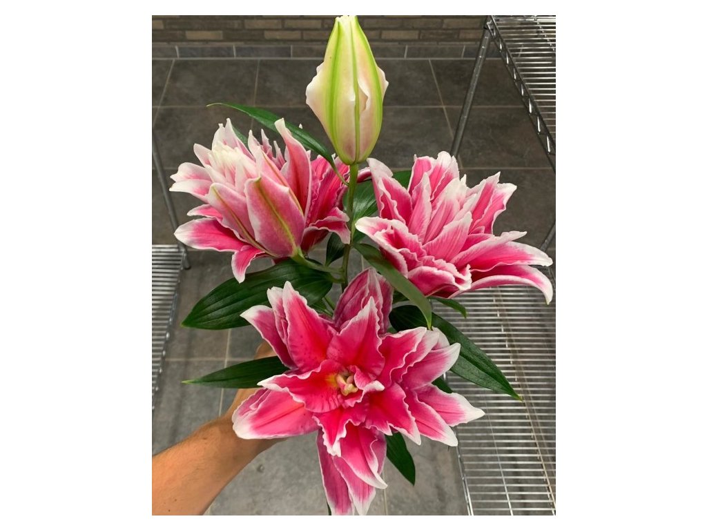 Krásná sytě růžová plnokvětá orientálka s bílými špičkami petálů.