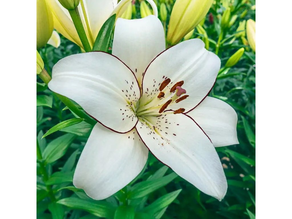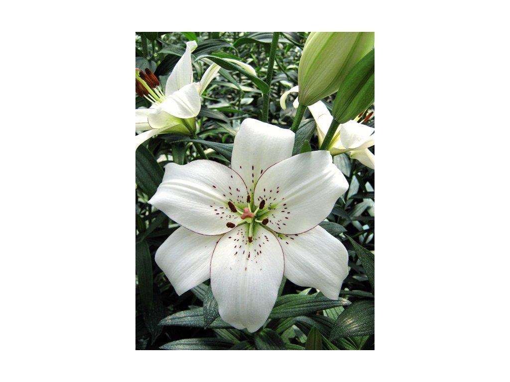 Nezvykle vybarvená lilie, je křídově bílá a tence olemovaná nitkovitou černou linkou. Střed květů je černě tečkovaný. Velké cibulky 18/20 cm.