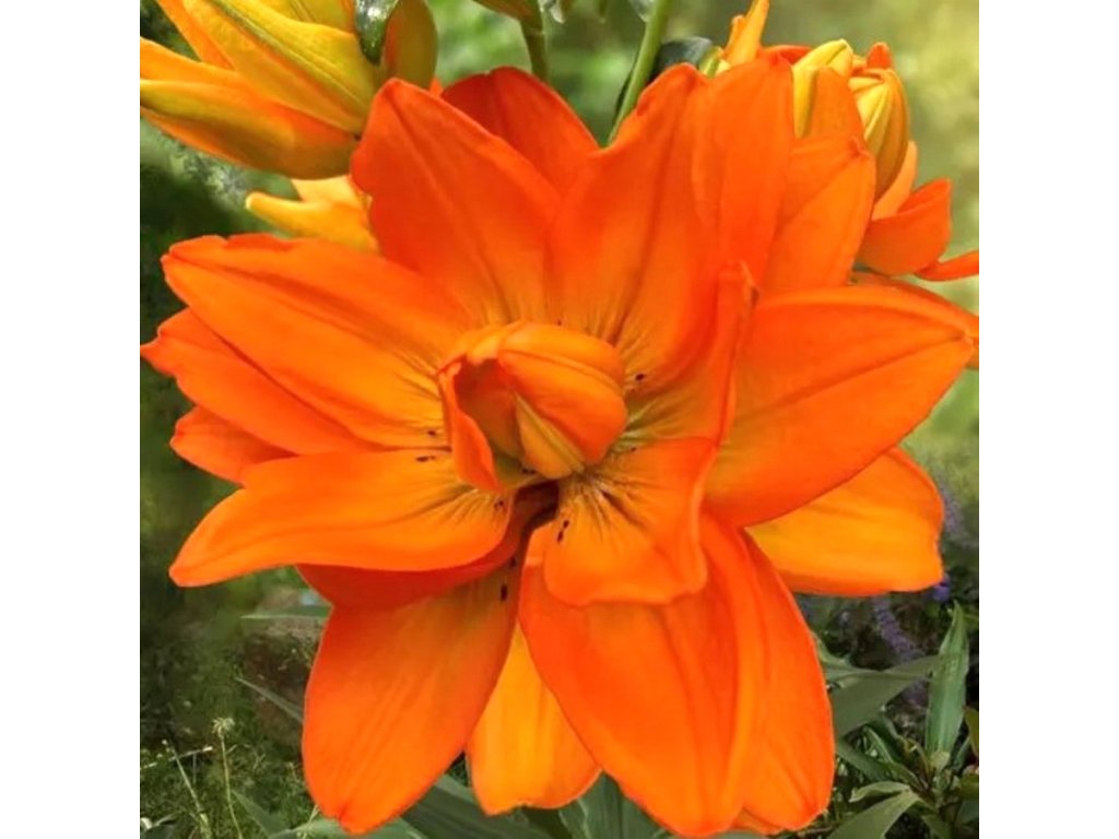 Plnokvětá asijská lilie, zlatožlutá s oranžovými odstíny. Pevné stonky a bez vůně.