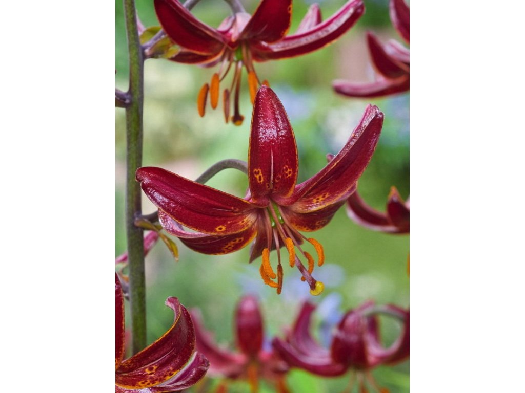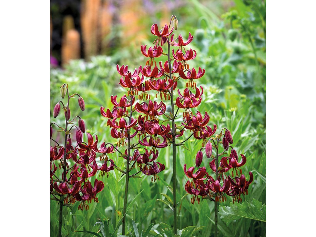 Impozantní Martagon lilie, se spoustou temně purpurových květů, ozdobených několika velkými žlutými tečkami. Může dorůstat až ke 2 metrům.