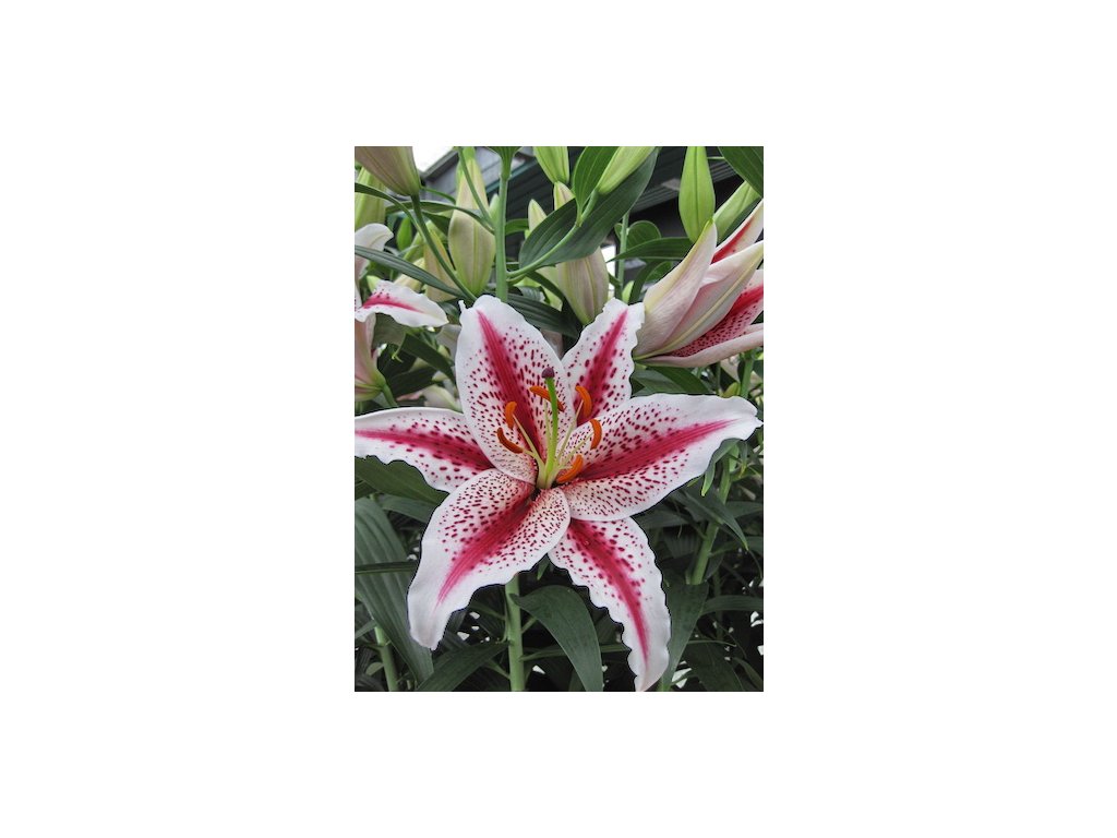 Velké, voňavé, vzhůru směřující bílé květy s tmavě růžovými pruhy na středních žilkách a mnoha tmavě růžovými skvrnkami se objevují v polovině až konci léta.