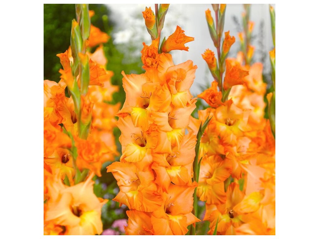 Velkokvětý meruňkově oranžový mečík. Dokonalá a působivá řezaná květina. Habitus rostliny vytváří krásné vertikální akcenty v květinovém záhonu.