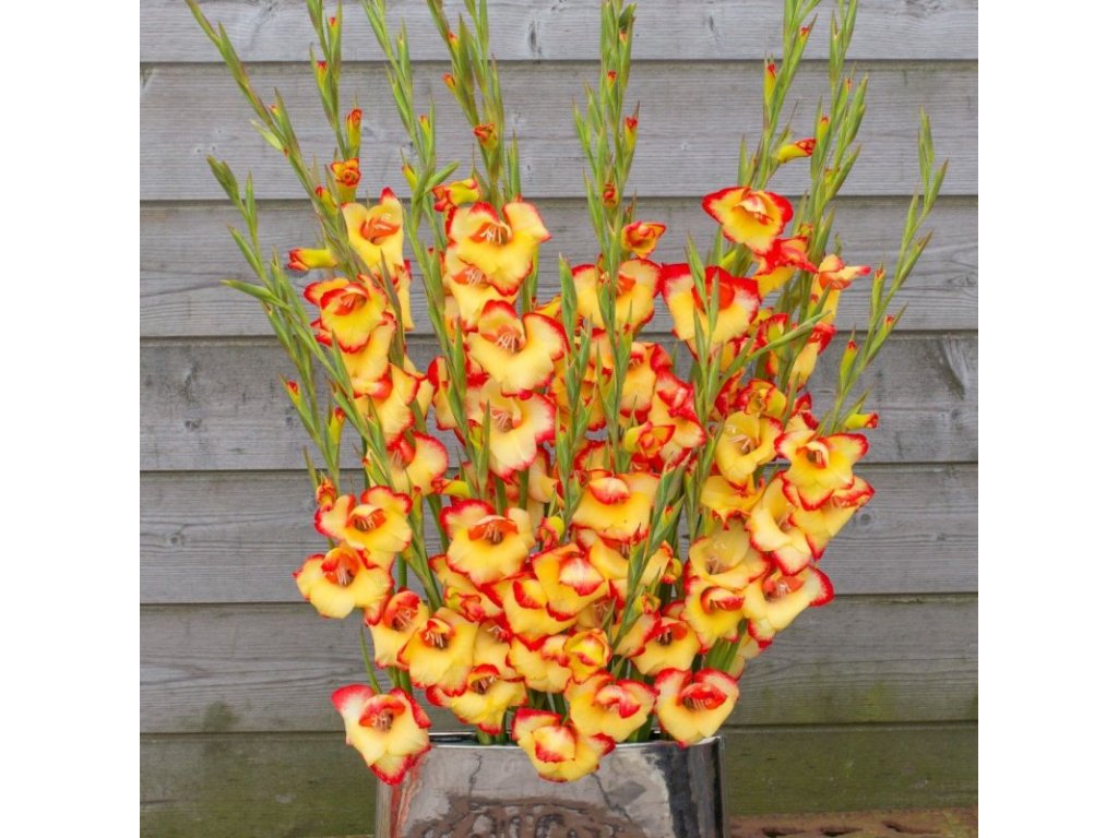 Žlutý nízký mečík s červeným okrajem květu, středně raný. Struktura rostliny vytváří krásné vertikální akcenty v květinovém záhonu. Skvělá také jako řezaná květina.