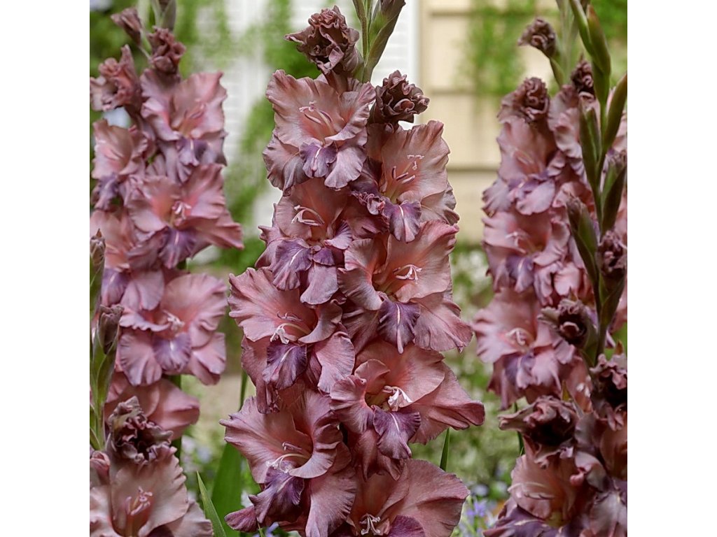 Velkokvětý, kaštanově zbarvený gladiolus s vlnitými, jemnými květy, ideální a působivá řezaná květina. Habitus rostliny vytváří krásné vertikální akcenty v květinovém záhonu.