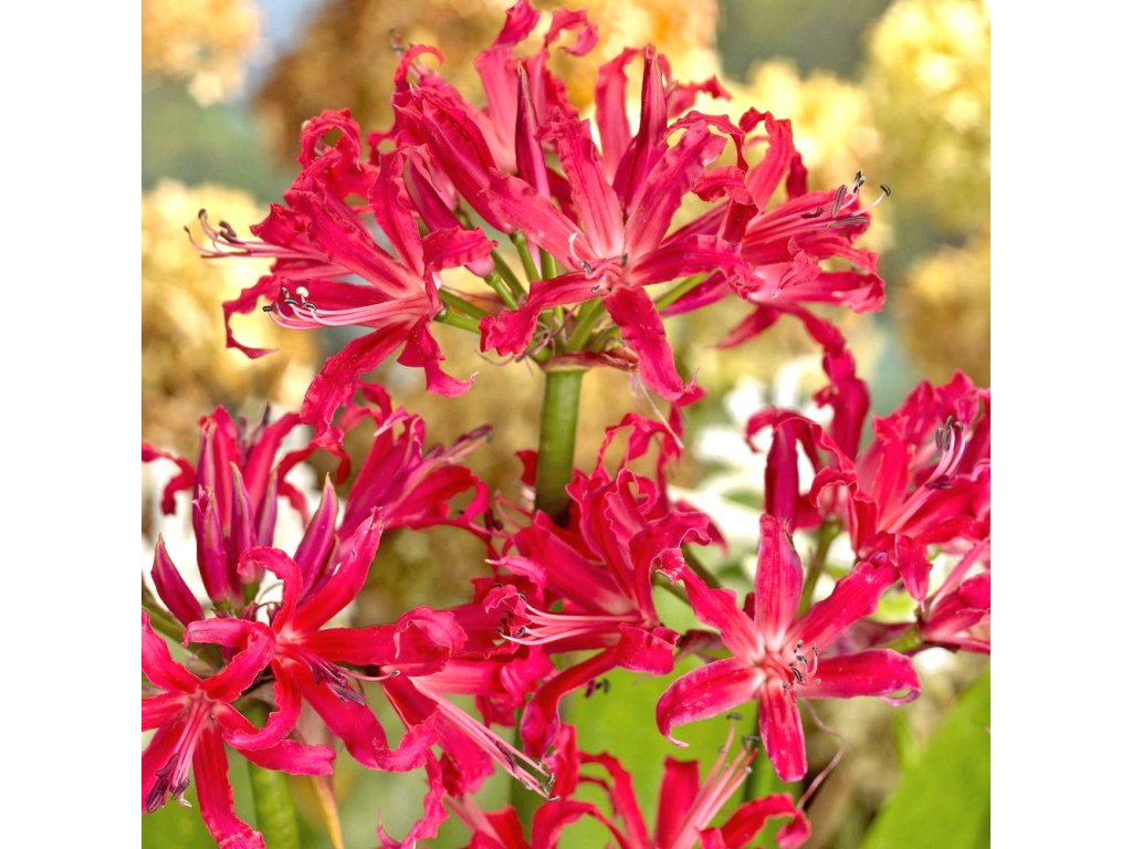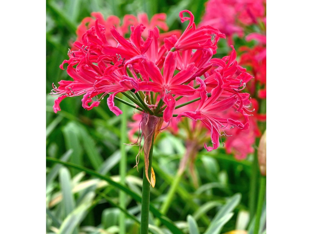 Třešňově červená nerinka. Na konci léta kvetoucí cibulovitá rostlina z Jižní Afriky. Pro stanoviště na plném slunci. Vynikající řezané květy.