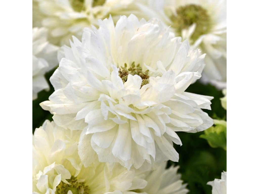 Bílá italská Levante sasanka. Atraktivní tvar, plné květy. Nejznámější jako řezaná květina, ale vhodná i do zahrady. V zimě lehce zakrývejte.