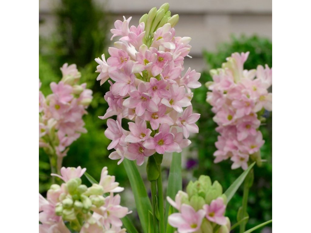 Tuberóza s růžovými, sladce vonícími květy. Potřebuje slunné a teplé místo.