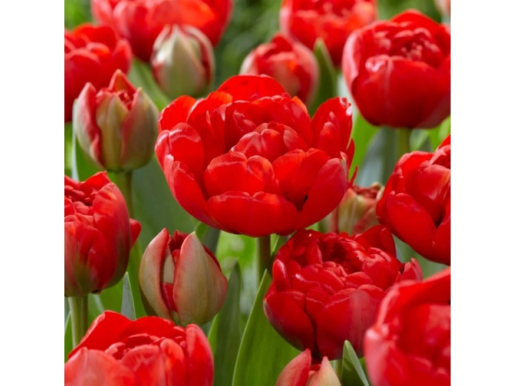 Plnokvětý tulipán, jehož zářivě červené květy jsou až 10 cm široké. Veliké cibule 12/+ cm.