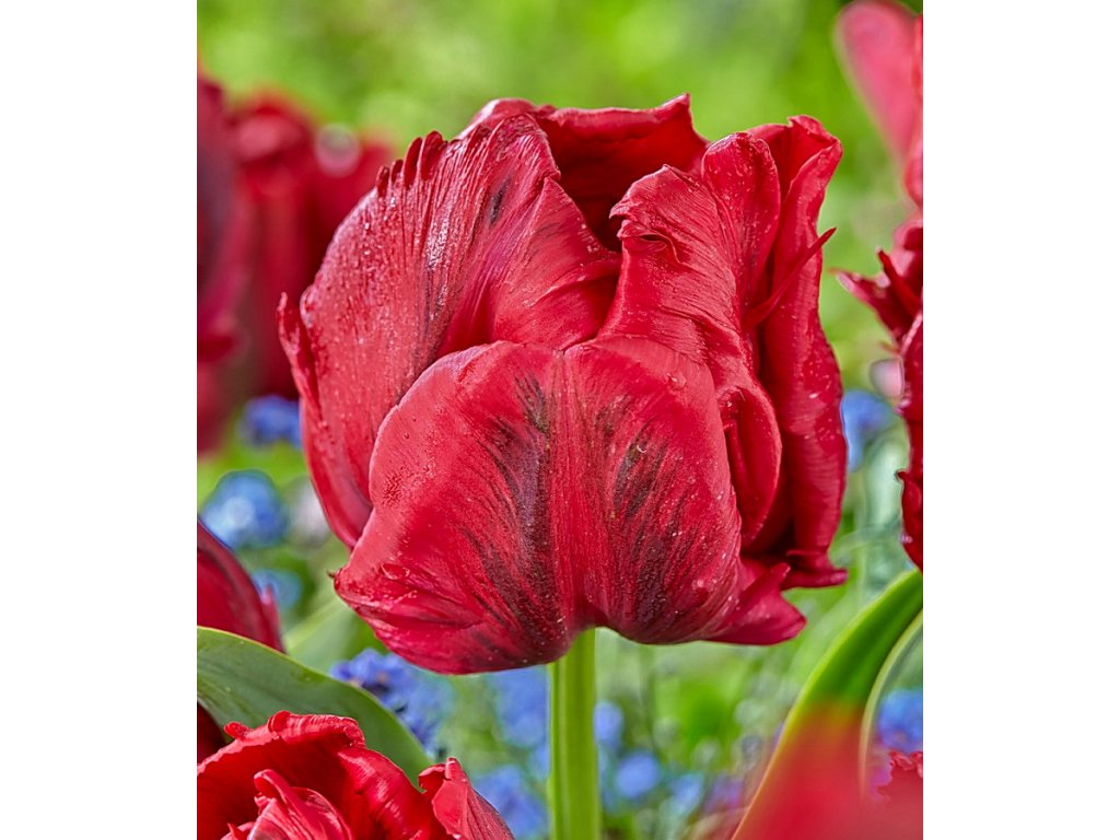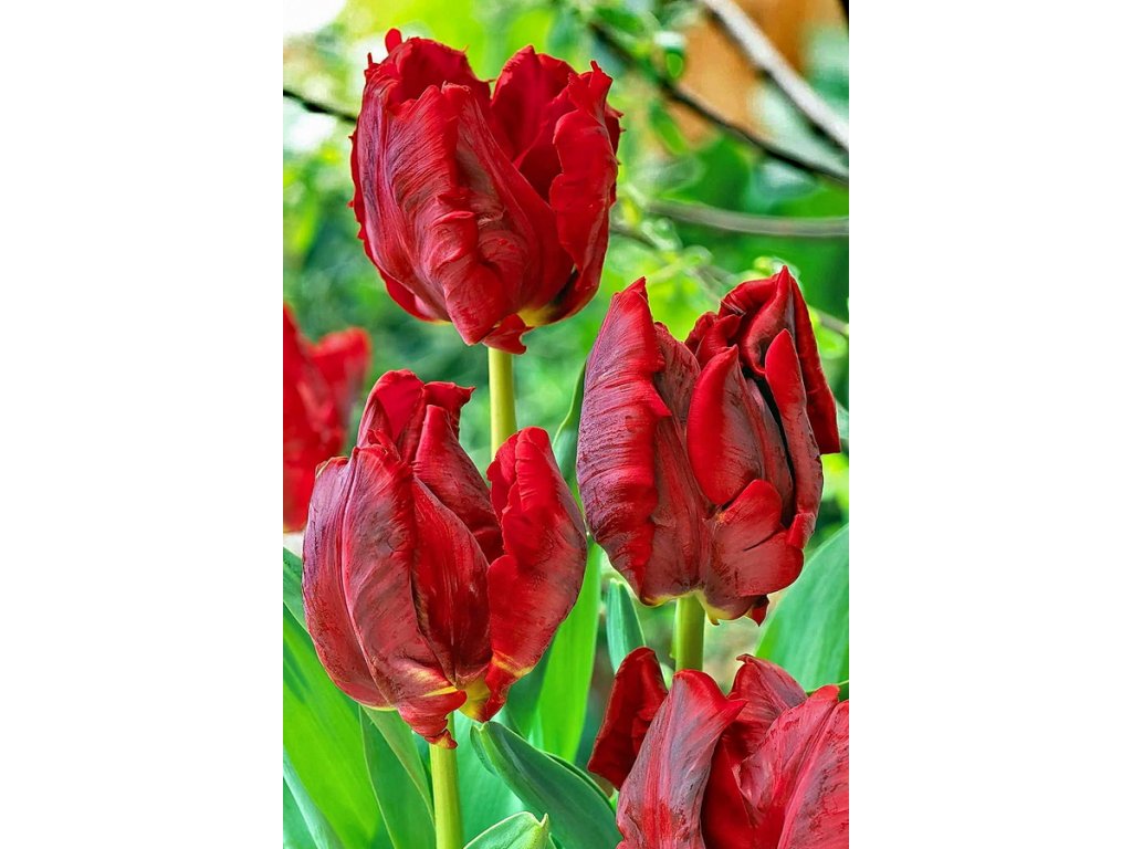 Papouškovitý tulipán s tmavě červenými květy. Veliké cibulky 12/+ cm.