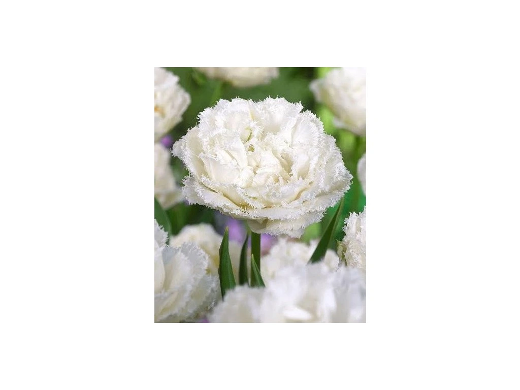 S plnými třepenitými sněhově bílými květy je tento nový tulipán cenným doplňkem každé zahrady. Vzhledem k dlouhé době kvetení a robustním stonkům jsou také velmi vhodné k pěstování ve vaší řezané květinové zahradě. Také se mu dobře daří v květináčích. Skutečně veliké cibulky 12/+ cm !