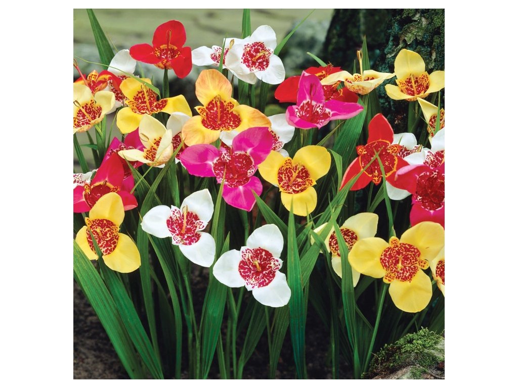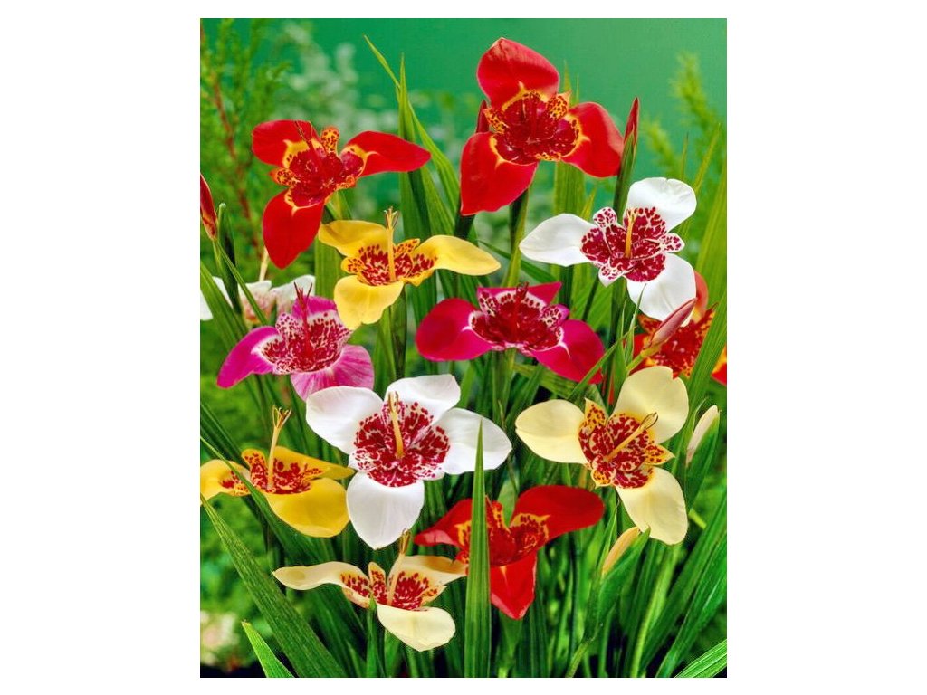Barevná směs tygřic. Každý květ vydrží jeden den, ale vytváří postupně množství velkých barevných květů.